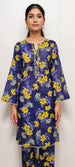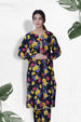 A vibrant black outfit adorned with yellow, red, and purple floral prints. Features lace detailing on the neckline, sleeves, and hem, paired with matching printed trousers for a cheerful yet elegant look.