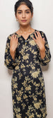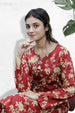 A rich maroon outfit with intricate beige floral prints. Designed with a simple round neckline and long sleeves, paired with matching printed trousers for an elegant and timeless appeal.