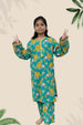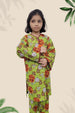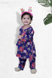 A cute two-piece girls’ set featuring a straight kurta with tassel detail, long sleeves, and a vibrant navy blue base with pink floral print. Made from soft, breathable fabric with matching pants for everyday comfort and style.