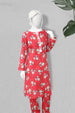 Red 2 PC with white leaf prints, round neckline with V-cut and lace detailing, paired with matching printed trousers.