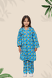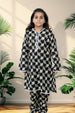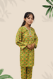 Black girls’ two-piece suit with beige floral print, lace trim on neckline and cuffs, paired with matching trousers.