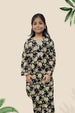 Turquoise girls’ two-piece suit with beige floral print, lace trim on neckline, cuffs, and hem, paired with matching trousers.