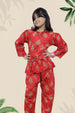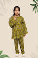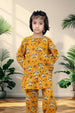 Girls’ yellow floral suit with round neck and frill hem top paired with matching trousers.