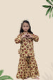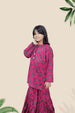 Beige girls’ two-piece suit with vibrant red floral print, lace trim on neckline, cuffs, and hem, paired with matching trousers.