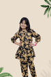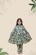 Girls’pink floral two-piece set with long-sleeve ruffle hem top and matching straight trousers.