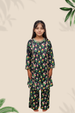 Girls’ bright pink floral suit with a round neck embellished with tassels and matching trousers.