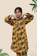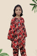 Girls’ blue floral suit with black lace trim neckline and white tassel details, paired with matching trousers.