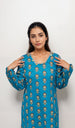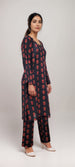 Red 2 PC with block floral prints, square neckline with lace and button embellishment, paired with matching printed trousers.