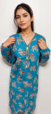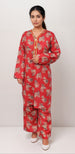 Yellow 2 PC with floral prints, V-neckline with button and lace detailing, paired with matching printed trousers.