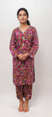 Blue 2 PC with multicolor floral prints, V-neckline with lace and button detailing, paired with matching printed trousers.