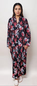 Navy Blue 2 PC with bold red and white floral prints, band collar with button placket, paired with matching printed trousers.
